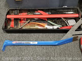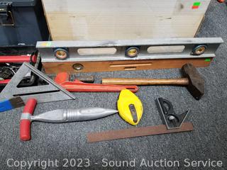 Levels, hammer, mallet, screwdriver, wrenches, hex keys, wire brushes, tin snips, hole saw bits, vise grips, etc. Refer to photos for lot contents.