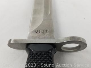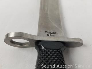 US.M16 China bayonet 14" long, 8.25" blade with leather sheathe. Stacked leather handle combat knife, 9.5" long, 4.5" blade, various wear from use.