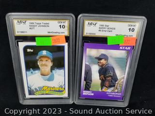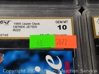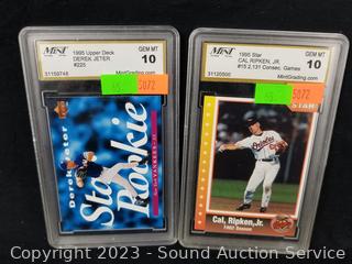 1995 Upper Deck Derek Jeter #225 & 1989 Topps Traded Randy Johnson #57T graded, 1990 Star Barry Bonds #8 Error Card, 1995 Cal Ripken Jr. #15 2,131 Consec Games GEM MT 10 graded baseball cards.