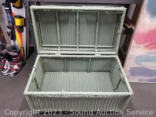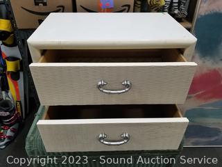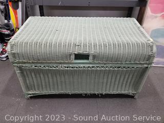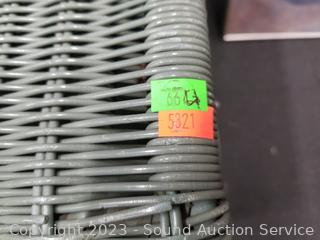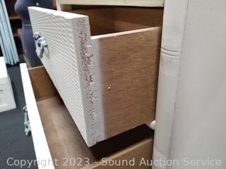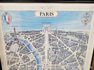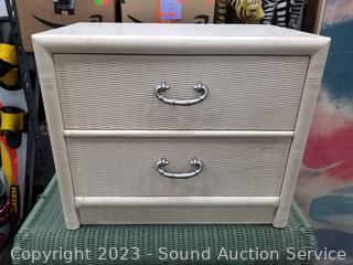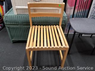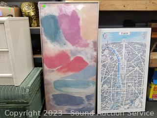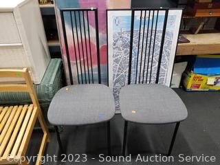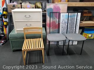 2 Fly Line Italy Black Metal Chairs (Some light scuffs, overall good condition. 39.5" H x 17" W x 18" to seat). Blonde Wood Slatted Seat Chair (Some scuffs, wear to finish. 28" H x 16.5" W x 16" to seat). One slat has a crack). Rattan Woven Chest (Has a lot of broken/damaged weave. 19" H x 35" W x 20" D). Ivory White Finish 2-Drawer Nightstand (Various scuffs & wear to finish. 22" H x 26" W x 16" D. Particle board construction, wood fronts, laminate top). Paris Street Map Print & Abstract Artwork (38" x 23" & 47" x 22").
