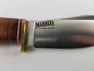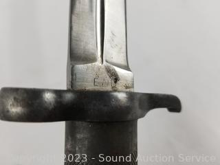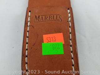 Marbles knife 8.25" long, 4" blade with leather sheathe, in excellent condition. Buck 11.5" long, 6" blade hunter with leather sheathe, in excellent condition. EAB 798 & Crown marked bayonet with scabbard, oiled blade, in great condition. 13" long, 8" blade.