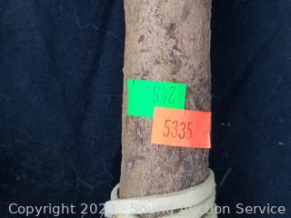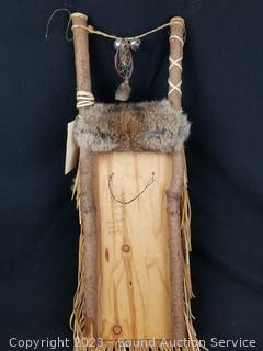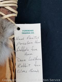 From Forbears Trading Co. with handwritten tag, "Hand Painted Porcelain Head, Buffalo Fur Hair, Deer LEather, Rabbit Fur, Glass Beads". Approx. 27" x 8". Don't see any issues.