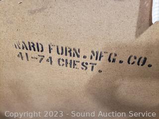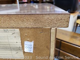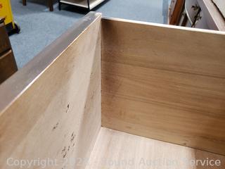 Some scuffs, wear to finish, overall good condition. Appears to be solid wood construction, dovetail joiner, laminate finish. 41" H x 34" W x 17.5" D.