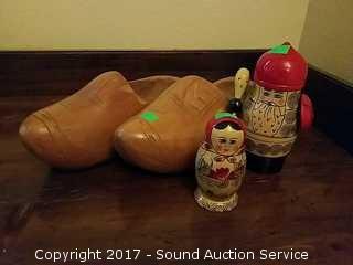 Lot #0319: Authentic Russian Nesting Dolls & Wooden Clogs