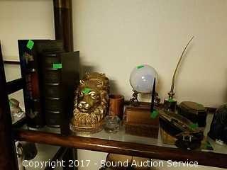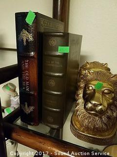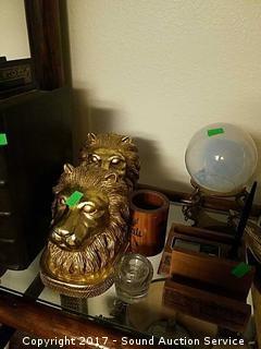 Includes: Brass pen set, clipboard, chalk lion head bookends, and hidden book containers.