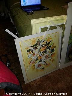 One is limited edition signed Melanie Boone, 2/500. Two are watercolors signed Dorris. 4 total. Frames fit art approx. 16" x 20", 18" x 22", 24" x 30".