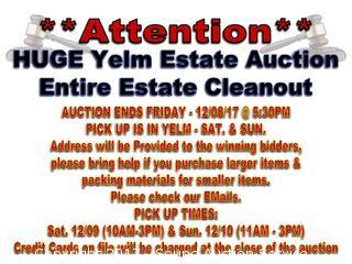 AUCTION ENDS FRIDAY - 12/08/17 @ 5:30PM PICK UP IS IN YELM - SAT. & SUN. Address will be Provided to the winning bidders, please bring help if you purchase larger items & packing materials for smaller items. Please check our EMails. PICK UP TIMES: Sat. 12/09 (10AM-3PM) & Sun. 12/10 (11AM - 3PM). Credit Cards on file will be charged at the close of the auction. This is a person's home, and it is sold, so let the staff gather your items for you. Please be patience, and respectful of the property. Please and thank you.