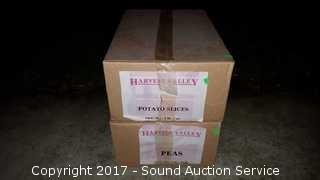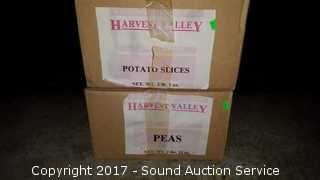 Packaged in 1988. Both boxes are sealed, each has 6 cans. Peas 2 lbs 12oz per can. Potato slices 1lbs 1oz per can.