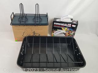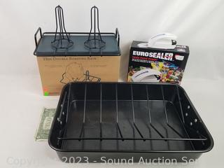 Euro sealer, non-stick roaster pan w/rack & hen double roasting rack.