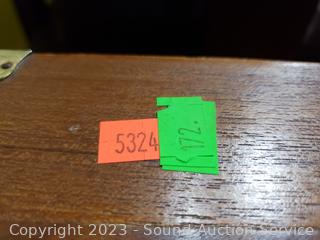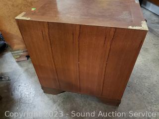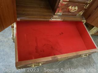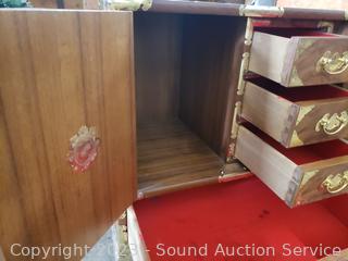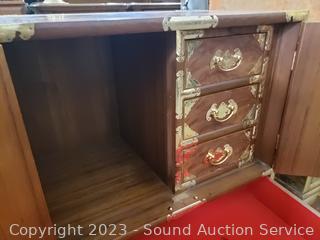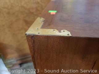 Solid wood construction, brass accents, hardware. Some scratches, scuffs in finish, mainly on the top. 23" H x 21.5" W x 14" D.