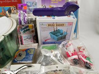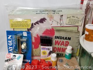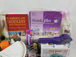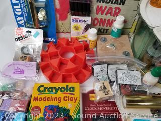 Brush washer, modeling clay, PolyShrink, paper dolls, Indian War Bonnet kit, stamps & more. Refer to photos for lot contents.