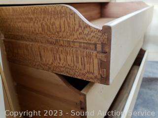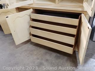 Adjustable glass shelves, lower cabinet space, in great condition, some minor wear, most appears to be intentional. Overall 80" x 57.5" x 16".