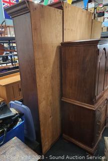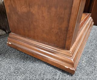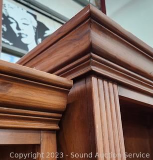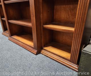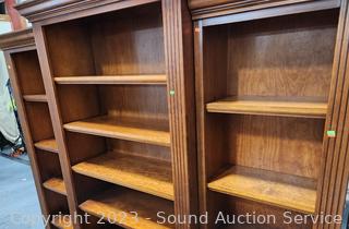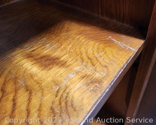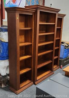 Solid wood construction. Has a bird & tree hallmark on the back. 12 shelves, total. 78" to 82" H x 88" W x 12" to 15.5" D. Some scuffs, scratches in finish.
