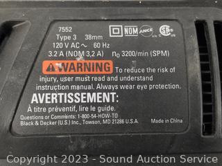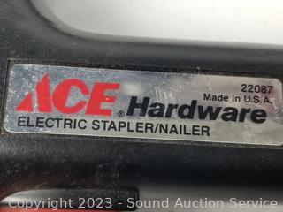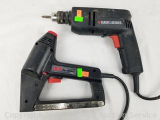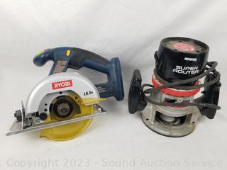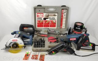 Craftsman Router, Ace Elec. Stapler, Profile Sander, Black & Decker 3/8" Drill, Black & Decker Scroll Saw (all works). Ryobi 18V circular saw & reciprocating saw, untested, no batteries or chargers. Various wear from use.