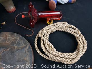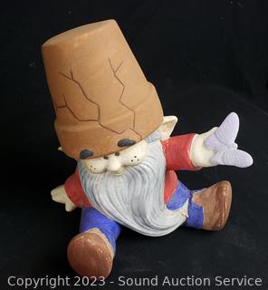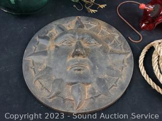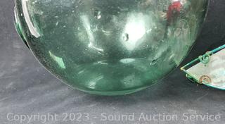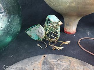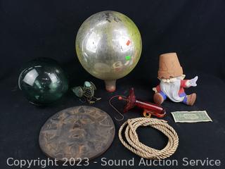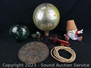 8" Glass Fish Float, Gazing Ball, pottery sun, ceramic gnome, glass hummingbird feeder, metal bird. Signs of weathering wear.