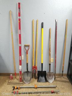 Shovels, rake, posthole digger, digging bar, 3ft pipe clamps, 6ft level.