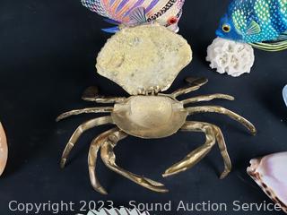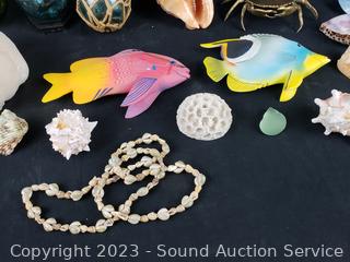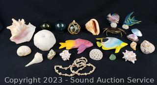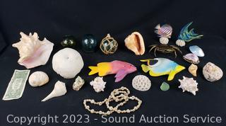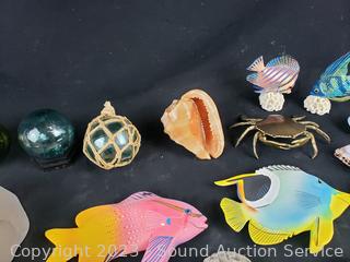 Japanese glass fishing floats, brass crab, wood fish, seashells, conch, coral. Refer to photos for more info.