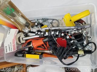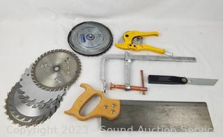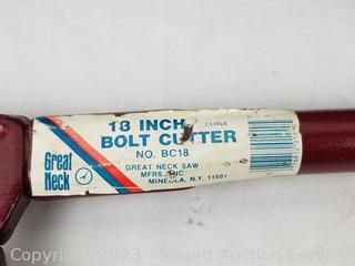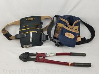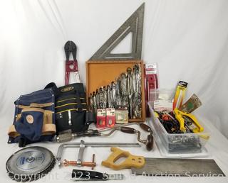 Reamer set, tool bags, 18" bolt cutters, torpedo level, braces, clamp, square, snips, pipe cutter & more.