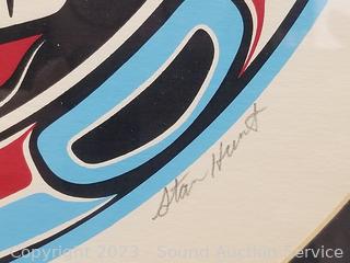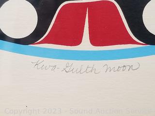 Signed by Star Heart, titled "Kwa-Gulth Moon", #439/600179. 24" x 24". Framed, matted with glass.