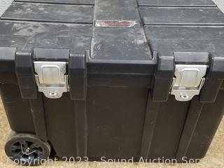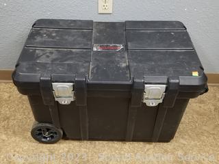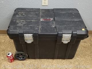 Telescopic handle, wheels for easier movement, eyelet for padlocks. Some scuffs, wear to finish. 19.5" H x 30" x 17.5".