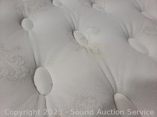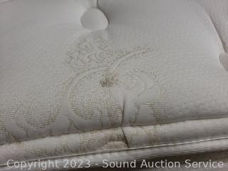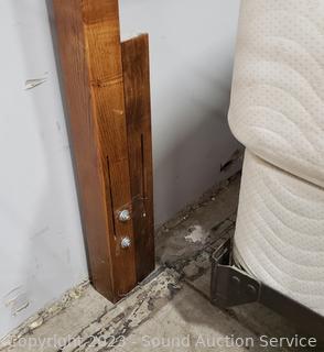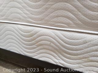 Mattress has a couple small stains, box spring has some water staining down the side. Headboard has some minor wear to finish, 57" H x 61.5" W. Steel rails.