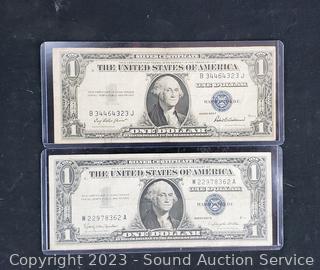 1976 $2 note, 1935F, 1957B, 1957 $1 Silver Certificates. ATTN: We are not coin or currency experts or graders, please use your own judgement when bidding.