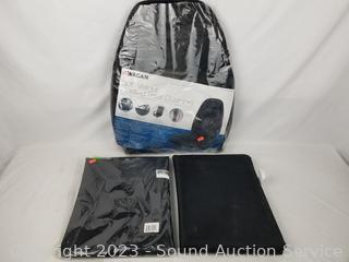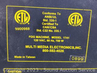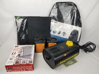Fog Machine (not functioning), Garage Door Mesh Guard, Windshield snow cover, Wagan Soft Velour Heated Seat Cushion, fog juice. Refer to photos for more info. ATTN: Items may be missing pieces, damaged, not functioning, complete, no issues, etc. All items as is. Refer to photos for lot contents.