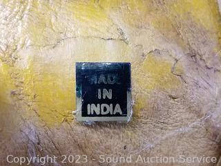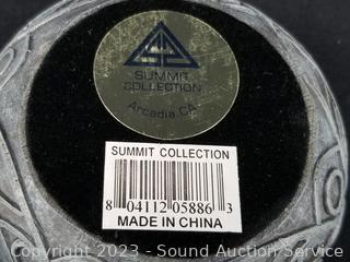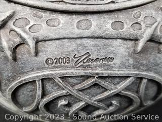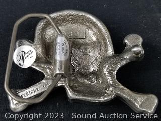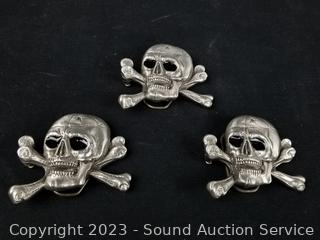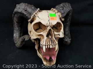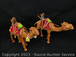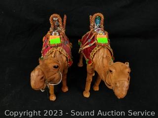 2 Leather wrapped camels, velvet lined camel dish, composite skull with split tongue & horns, 3 pewter skull & crossbones, dragon sword/knife stand.