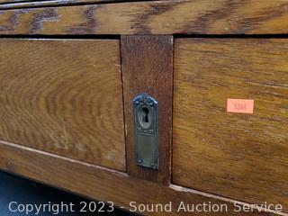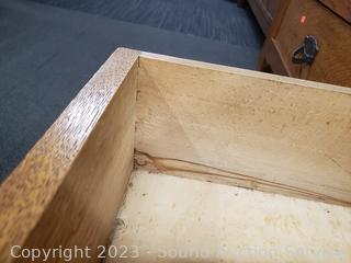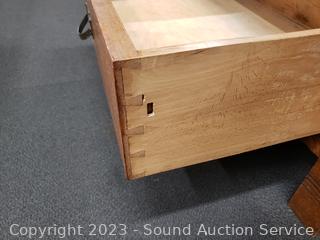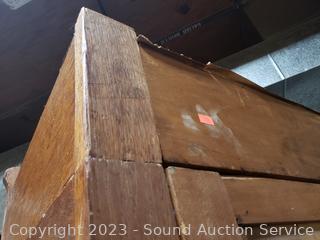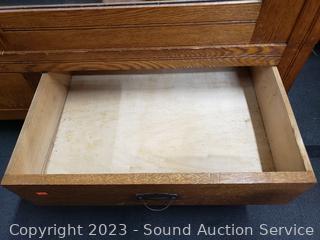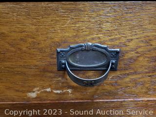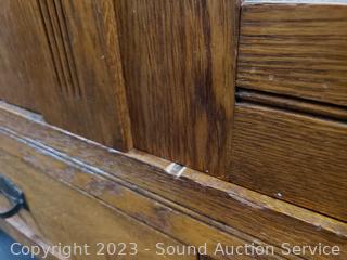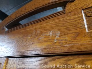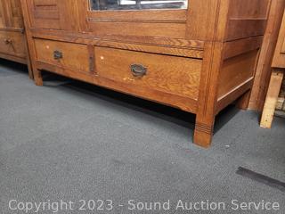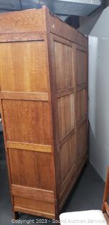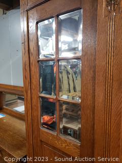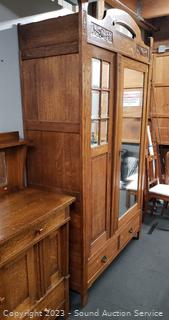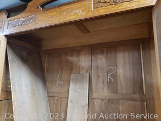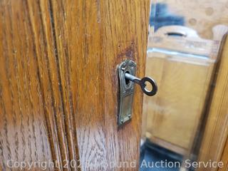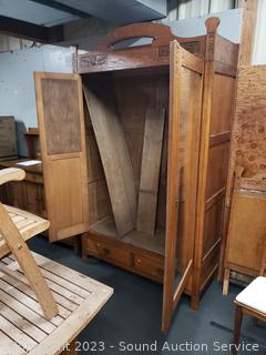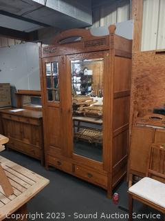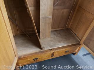 Rose motif, beveled mirrors, skeleton key locks with keys. 2 Shelves, no rod (has a space for a rod), 2 drawers. Some minor scuffs, scratches. 90.5" H x 53" x 21.5"