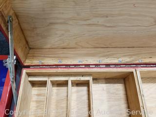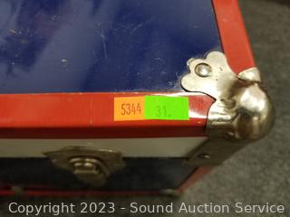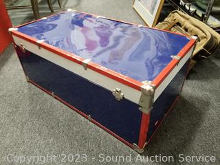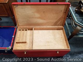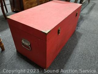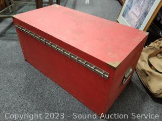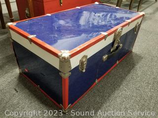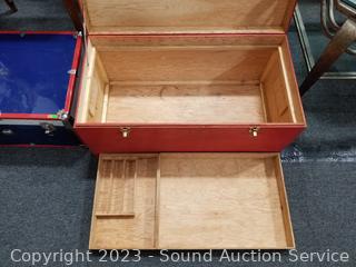 Lot #0031: Red Wood Chest & Blue/Red Metal Footlocker Chest