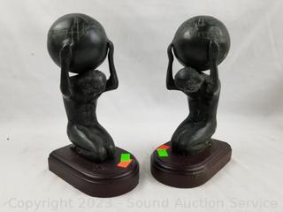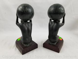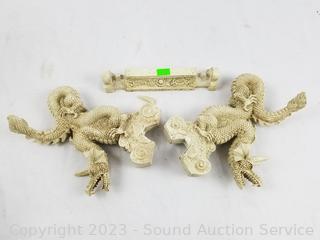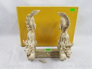 2 skull & cross bones pewter belt buckles, composite skull with horns, atlas bookends, composite dragon sword/knife holder (one dragon has a broken horn, comes with piece).