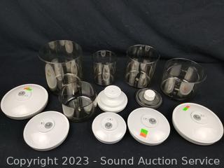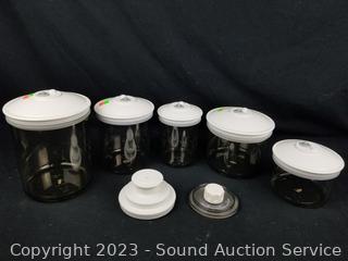 Pampered Chef 16" pottery roaster, signed honey pot & 12.5" platter, 5 vacuum seal containers, 3" to 6.75" H x 4" to 6" Dia.