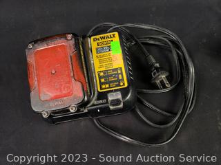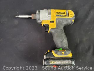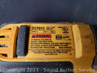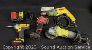 DeWalt 12V Max comes with 2 batteries & charger, Milwaukee 12V 3/8" impact comes with battery, no charger. DeWalt 1/2" Hammerdrill, Ryobi Angle grinder. All work. Various wear from use.