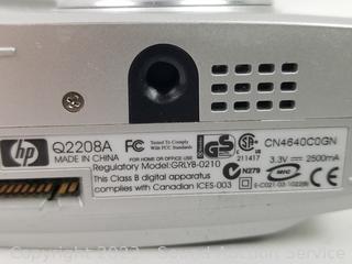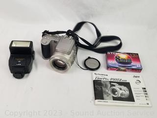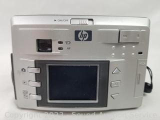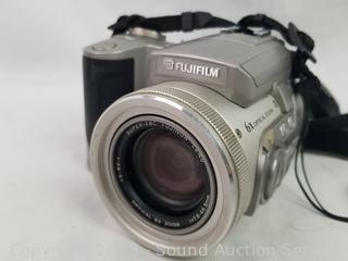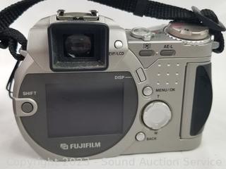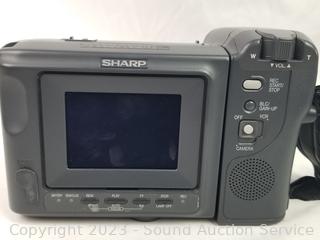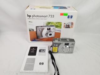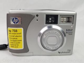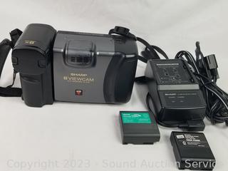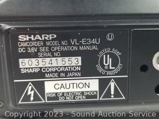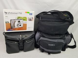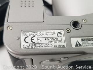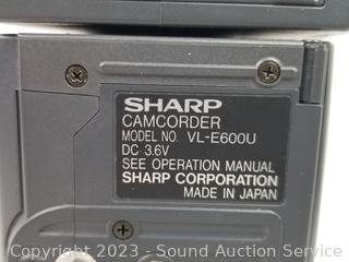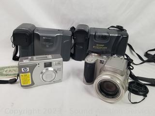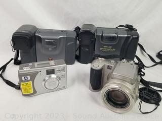 HP Photosmart 733 (works). Sharp Viewcam Hi-Fi Monaural 8 Cam, has power, comes with manual, case, tape. Sharp 8 Viewcam Hi-Fi Monuaral VL-E34, battery not charging, powers on with power supply, comes with case. Fuji Film Fine Pix 4900 Digital Camera, comes with flash, manual, Targus bag, no battery.