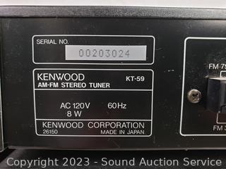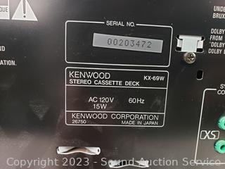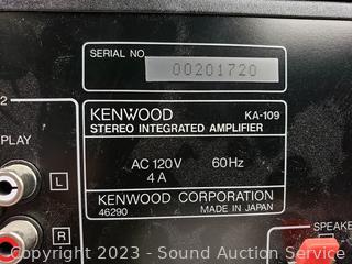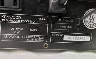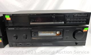 Kenwood Stereo Integrated Amplifier KA-108 (not functioning, no sound from outputs). Kenwood Quartz Synthesizer AM-FM Stereo Tuner KT-59. Kenwood AV Surround Processor SS-79 (appears to be functioning as intended), Kenwood Double Cassette Deck KX-69W (works). Comes with various wires, transfer cables. Amp face has come unglued, comes with piece. As is.