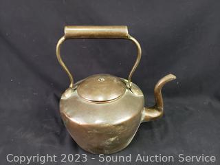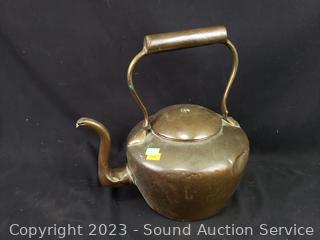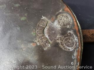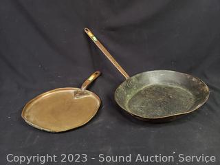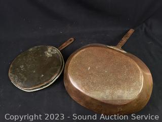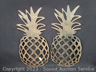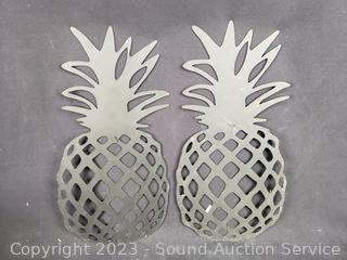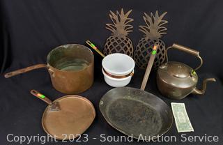 ceramic/copper sauce pan, 9" flat skillet, teapot, 9" sauce pan, 13" x 10" skillet, (2) 14" x 7" pineapple decor. Various dents, bends.