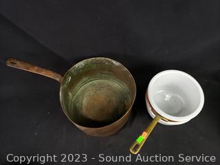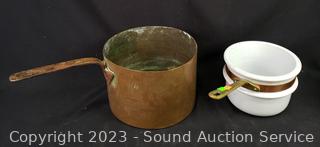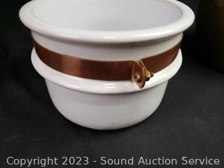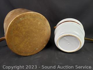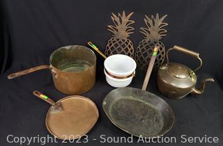 Lot #0114: 5pc Copper/Ceramic Cookware & 2pc Pineapple Decor/Trivets