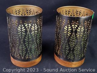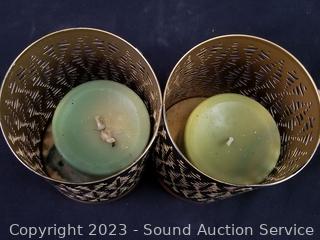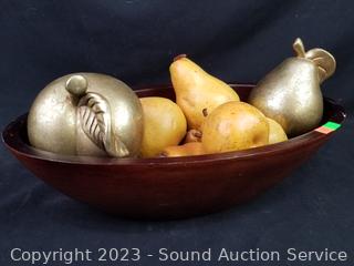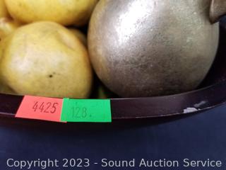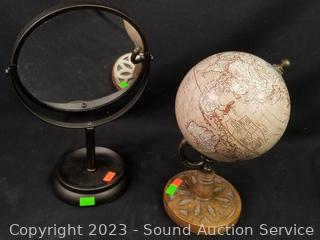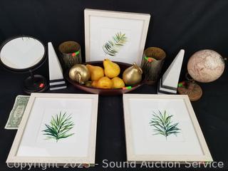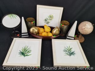 Globe decor, vanity mirror, candle votives, 2 stone pyramids, decorative faux fruit bowl, 3pc wall decor.