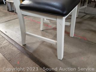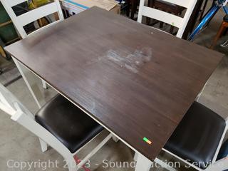 Top has a white scuff mark on the top, see one chair with small hole in the vinyl seat. Some other minor scuffs in finish. 30" H x 48" x 35.75".