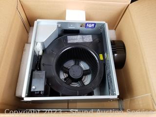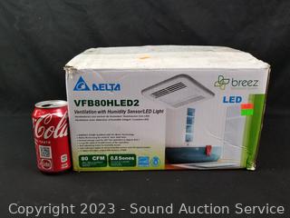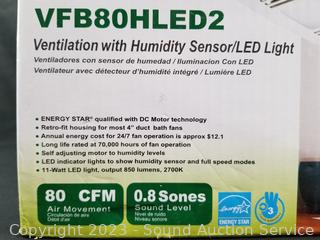 Model VFB80HLED2. 80 CFM, 0.8 sones. 11W LED, 850LM, 2700K color. Fits 4" duct, housing dimensions 8.25" x 8" x 5.75". Has power, appears new, complete.