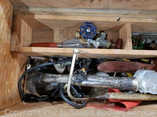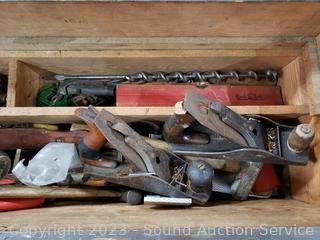 Hammers, auger bits, planes, chisels, punches, nails & more. Refer to photos for lot contents. 13" H x 34" L x 12" D.