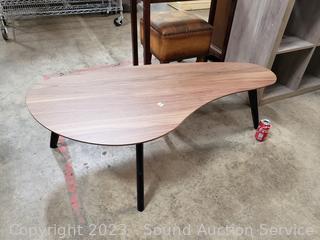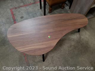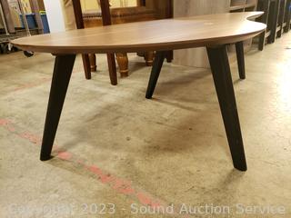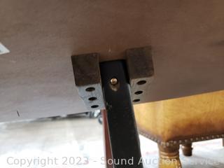Various wear to finish on legs. Don't see any other issues. Wood grain finish. 15" H x 47" x 23".