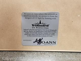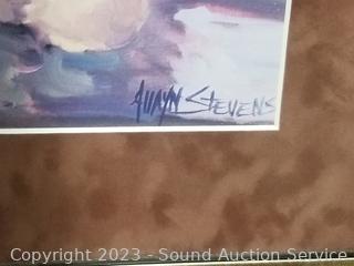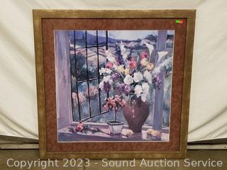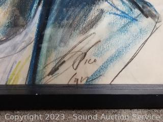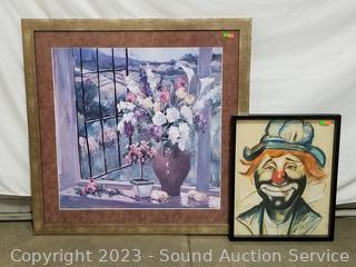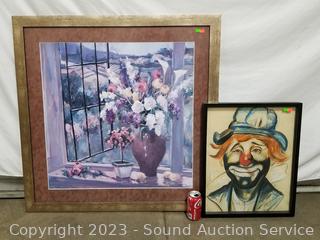 Refer to photos for signature on Emmett Kelley charcoal artwork, signed Rico? Floral print originally by Juayn Stevens. 21" x 17" & 35.5" x 35.5".