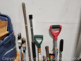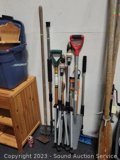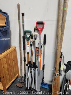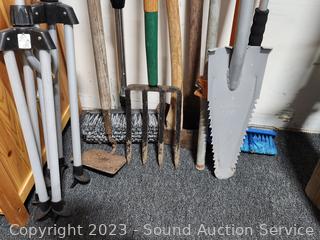 Hoe, vehicle watering cleaning brushes, sprinklers, splitting axe, potato forks, bar clamp, root assassin shovel, gaff hook.