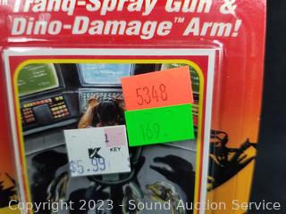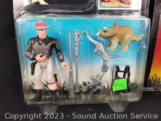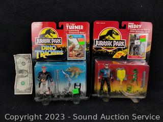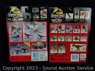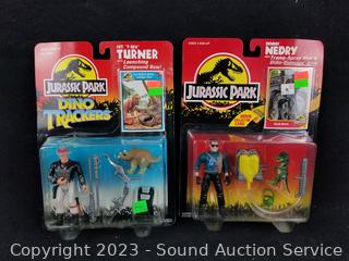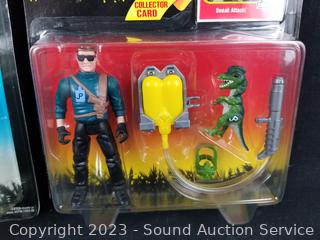 Dennis Nedry w/Tranq-Spray Gun & Dino-Damage Arm & Sgt. T-Rex Turner w/Launching Compound Bow. Both are sealed, one the packaging is starting to separate from plastic.