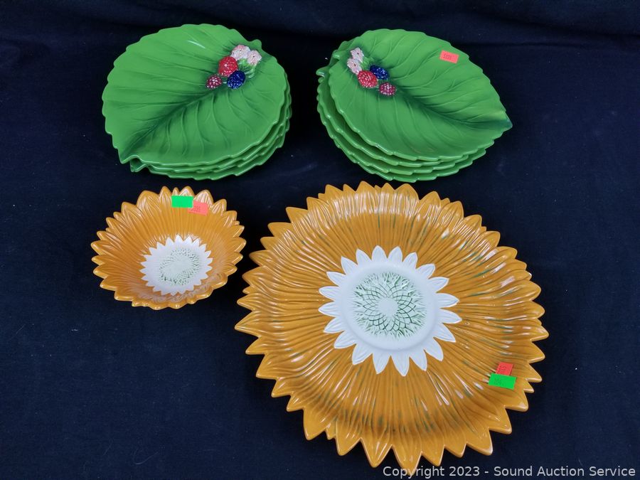 Temp-tations "Figural Fruit" (3) 6.5" bowls, (3) 12oz Mugs (one with a crack), (8) plates, McCoy teapot, HOM Sunflower bowl & plate, Grape Decanter w/4 goblets (unmarked), 2 scented Home Works Strawberry & Pumpkin candles.