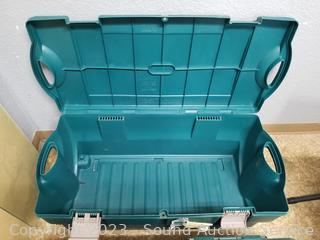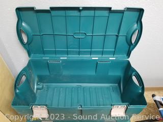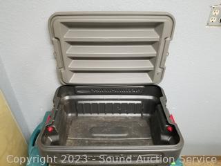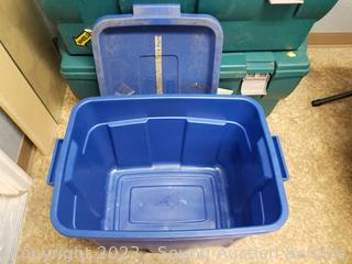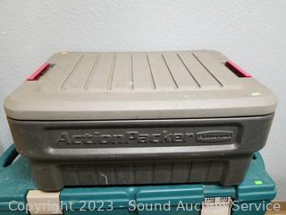 Rubbermaid Roughneck 16" H x 21" x 15", Rubbermaid Action Packer 12" H x 25.5" x 17.5", 2 Tucker Totes 15" H x 33.5" x 17". Signs of wear from use.