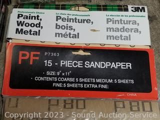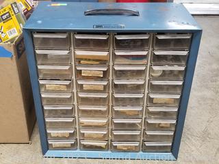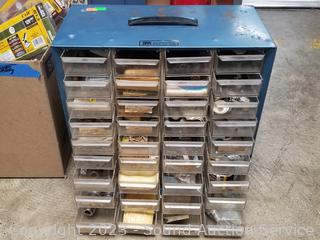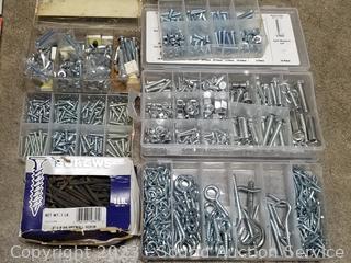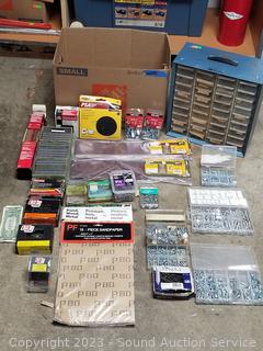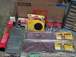 Hardware organizers, nuts, bolts, staples, screws, 4" x 36" sanding belts, & more. Refer to photos for lot contents.