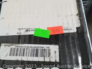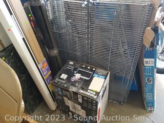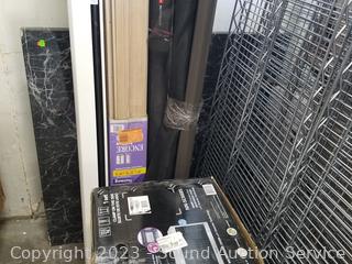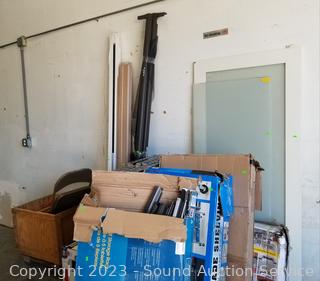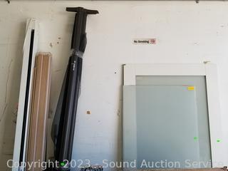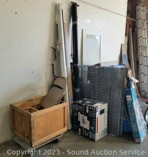 wood crate 18.5" H x 26" x 23", metal folding chair, Panasonic microwave, Steel shelving parts, marble laminate table top, steel toolbox, 71" x 24" piece frosted glass, 78.5" x 31" x 3/4" glass panel/door, 48" x 18" steel shelves, 8ft Panaview projection screen, Fasttrack rails & more. ATTN: Items may be missing pieces, damaged, not functioning, complete, no issues, etc. All items as is. Refer to photos for lot contents.