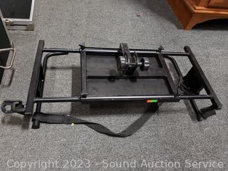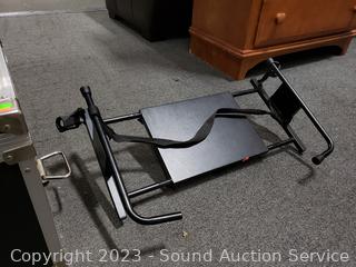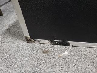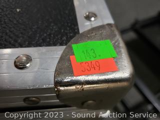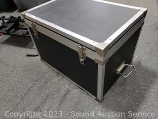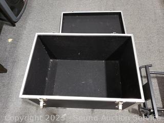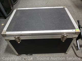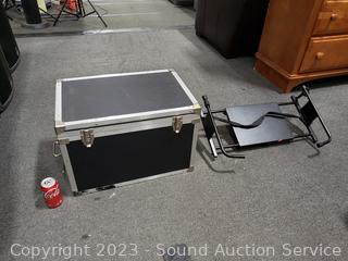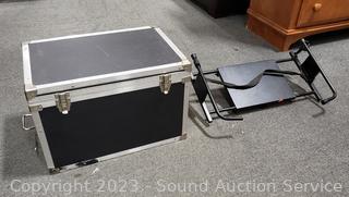15" H x 22" x 15" box. Adjustable rolling stand, approx. 15.5" to 25" x 13" roller stand. Some black tar like residue.